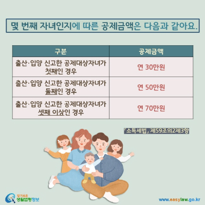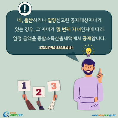 해당 과세기간에 출산하거나 입양 신고한 공제대상자녀가 있는 경우 첫째 30만 원, 둘째 50만 원, 셋째 이상인 경우 연 70만 원을 종합소득 산출세액에서 공제합니다.