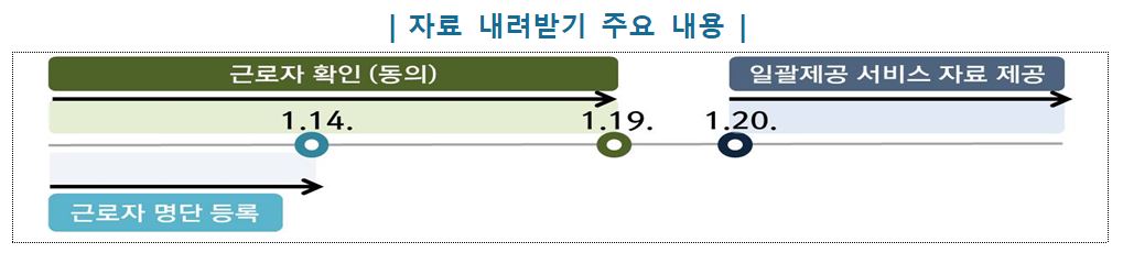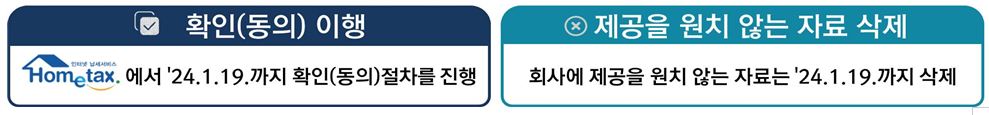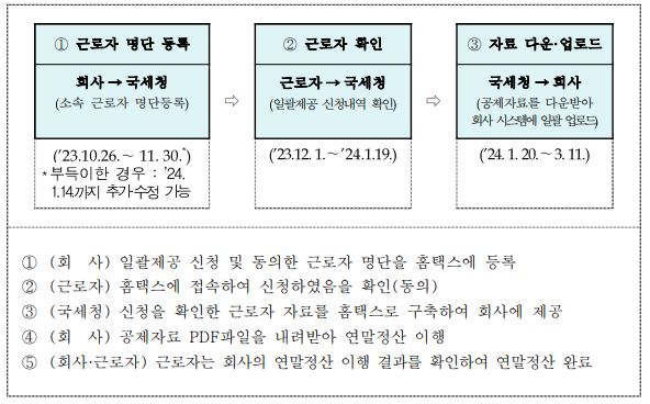 회사는 연말정산 일괄제공을 신청한 근로자 명단을 홈택스에 등록('23.10.26.~'23.11.30.)하고 근로자가 홈택스에서 '23.12.1.~ '24.1.19. 까지 일괄제공 되는 회사와 제공 자료의 범위등을 최초 1회 확인(동의) 해야 합니다.