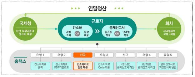 국세청은 자료제공 확인(동의)이 된 근로자의 연말정산 간소화 자료를 '24.1.20.부터 순차적으로 회사에 일괄 제공하고, 회사는 홈택스를 자료제공에 동의한 근로자의 간소화 자료를 내려받아 연말정산을 진행하게 됩니다.