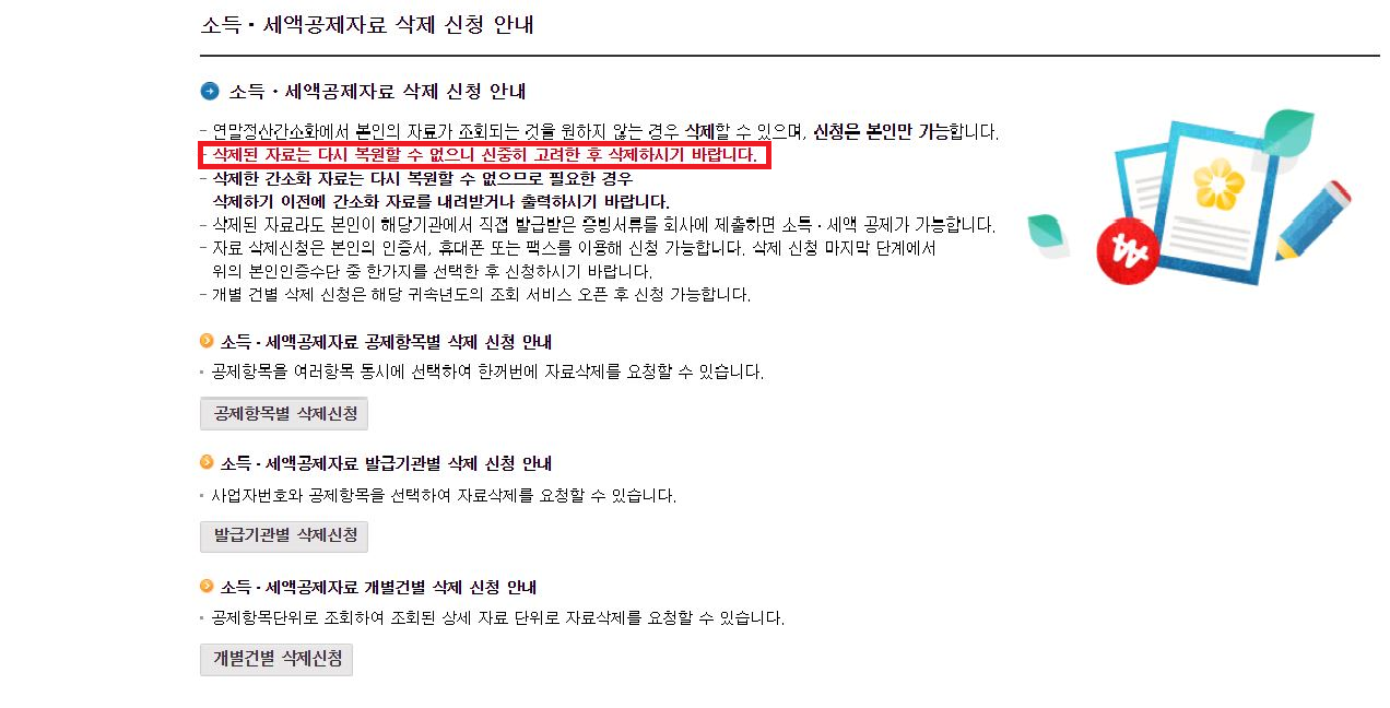※ 간소화 서비스 개통일(1.15.) 이후에는 개별 건별(특정 자료) 삭제도 가능합니다.
